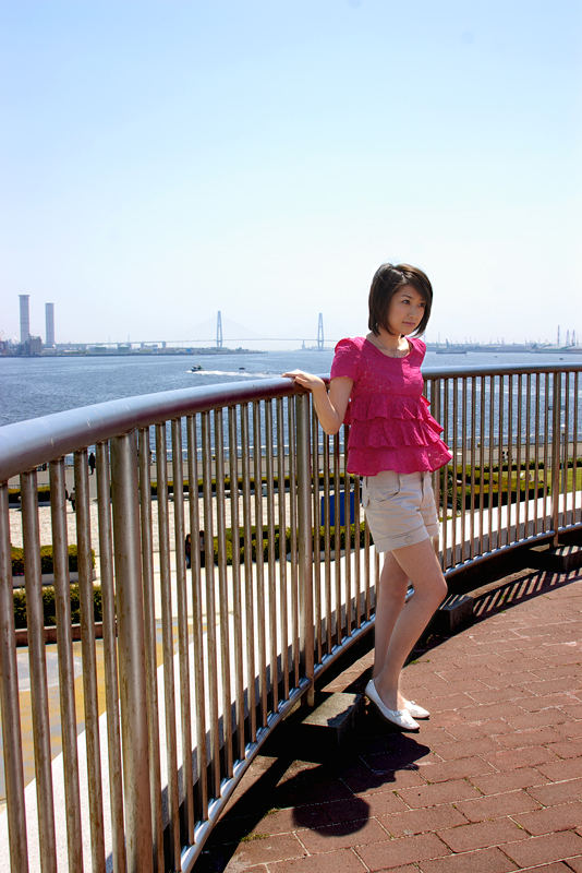 バックは名古屋港ガーデン埠頭、奥には名港トリトン(伊勢湾岸自動車道)が見えます。